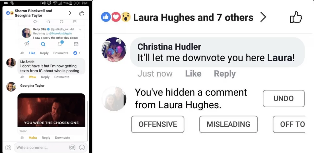 Sådan ser det ud, når man prøver at “nedstemme” en kommentar. Funktionen er dog først tilgængelig, når man har skjult en kommentar. (Screenshot: Christina Hudler / Facebook / TechCrunch)
