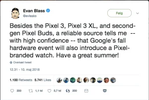 Evan Blass er kendt for sin insiderviden og læks. På Twitter skriver han, at til efteråret vil Google lancere et smartchwatch i Pixel serien. Han skriver også, at vi også kan forvente at se Pixel 3, Pixel 3XL og anden generation af Google Pixel buds ved Googles hardware event i efteråret.