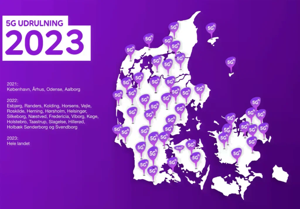 Planen er, at landets fire største byer får 5G i 2021, mens 21 større byer får 5G i løbet af 2022. Den resterende del af Danmark vil således først få 5G i løbet af 2023.