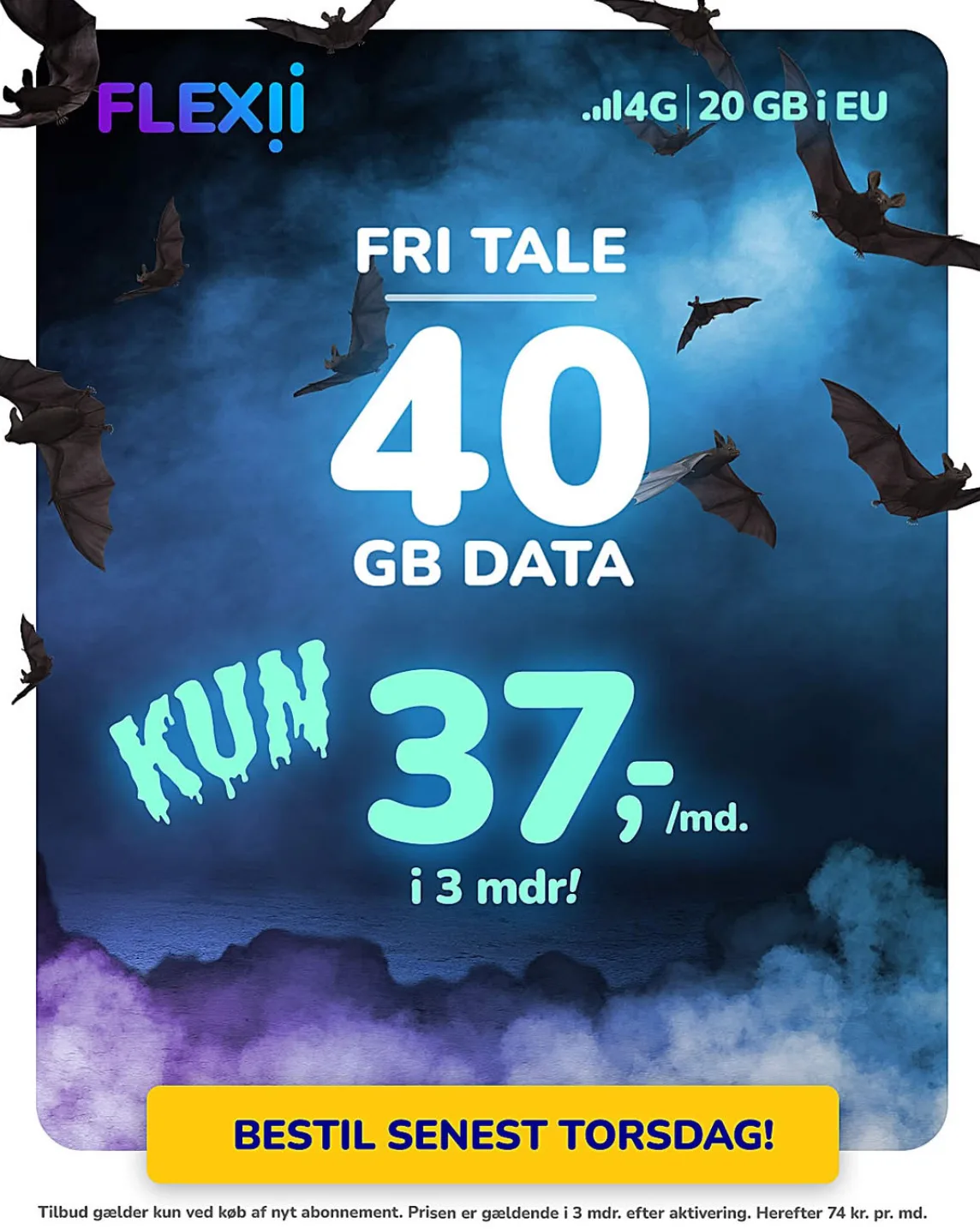 Også hos Flexii har de et godt Halloween-tilbud. Og din online frihed er sikret med hele 40 GB data, nok til timevis af streaming, musik og browsing – uden frygten for at løbe tør.