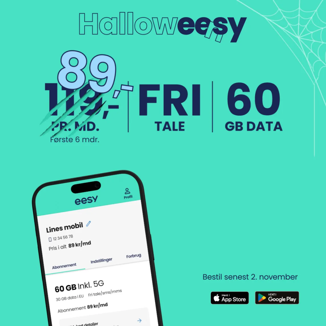 Hos Eesy er de også klar med Halloween-tilbud. Her giver de f.eks. dobbelt op på to af deres abonnementer frem til og med 2. november 2025.