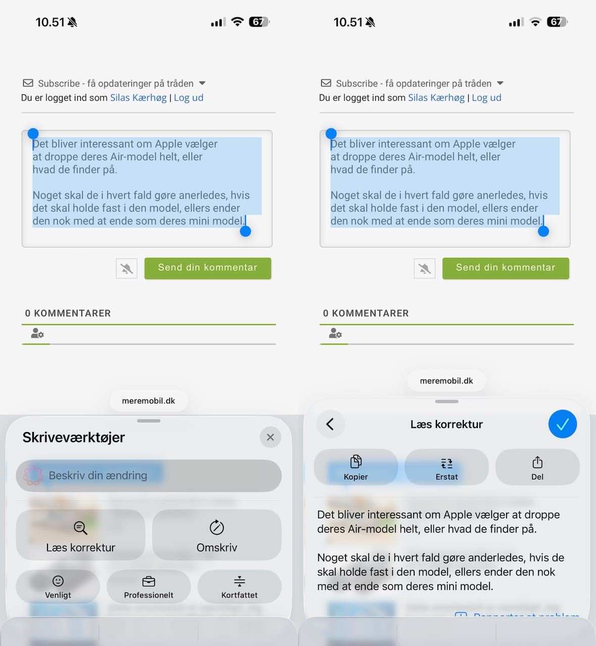 Herfra kan du bede Apple Intelligence om at læse korrektur, omskrive, gøre teksten mere venlig, professionel eller kortfattet.