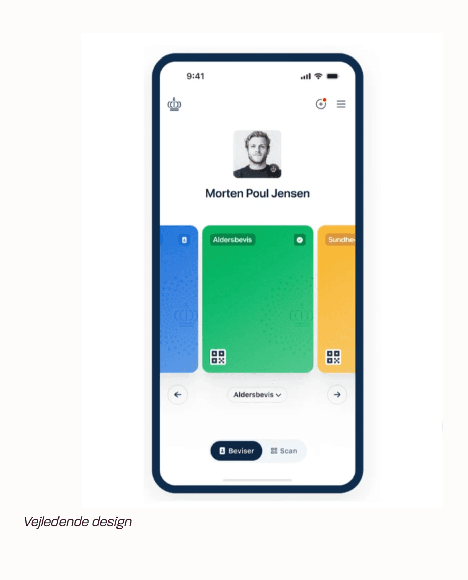 - Legitimationsbeviset: Den digitale version af pas og kørekort. Den store forskel er, at du selv kan vælge, hvilke oplysninger du deler i den enkelte situation. Skal du hente en pakke, kan du nøjes med at vise dit navn; ved medlemskab vælger du kun de nødvendige oplysninger.